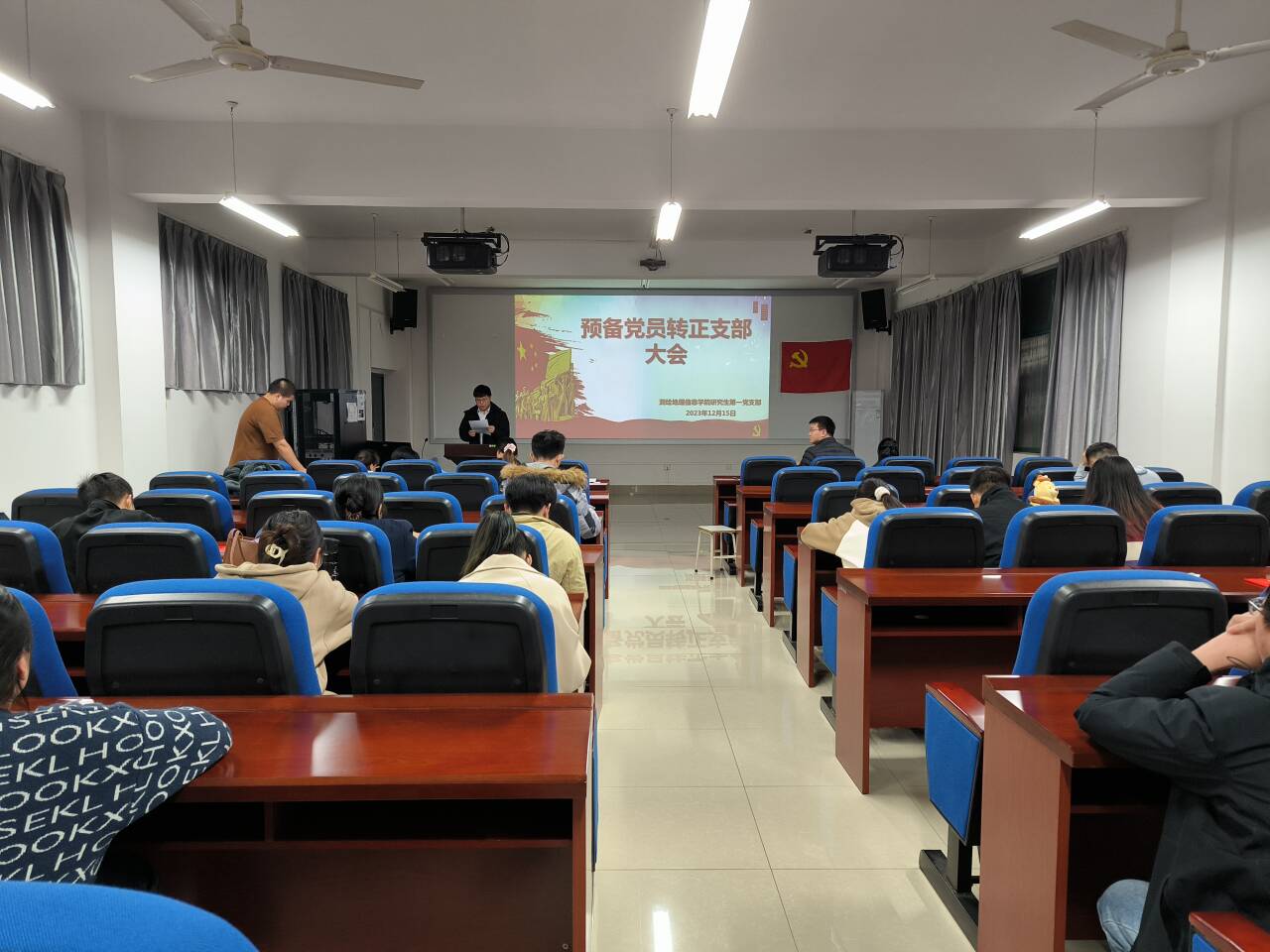 2023年12月15日晚,我院研究生第一党支部在雁山校区02319召开预备党员转正大会,本次会议由支部副书记张文杰同志主持,会议对预备党员胡鹏程、兰艳萍、孟春阳3名同志转为正式党员的问题进行讨论和表决。
