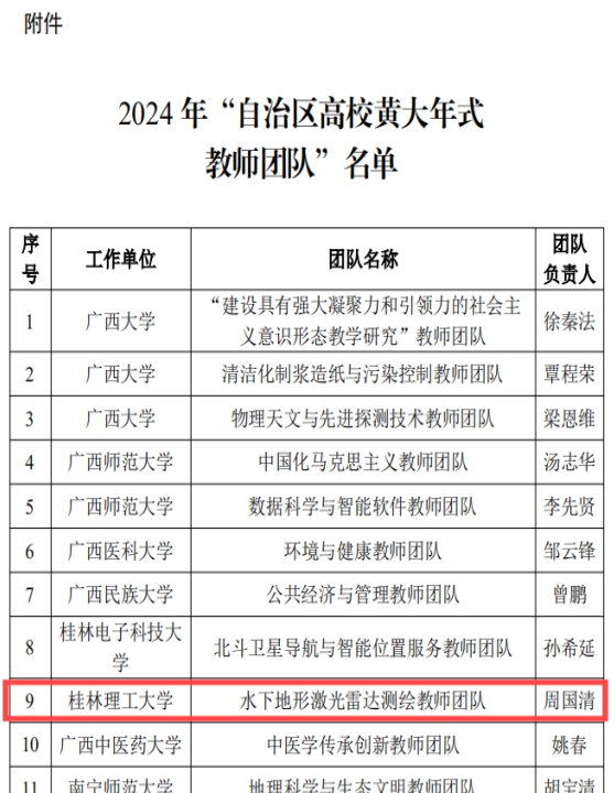 近日,自治区教育厅公布2024年“自治区高校黄大年式教师团队”名单,由周国清教授领衔的水下地形激光雷达测绘教师团队成功入选。